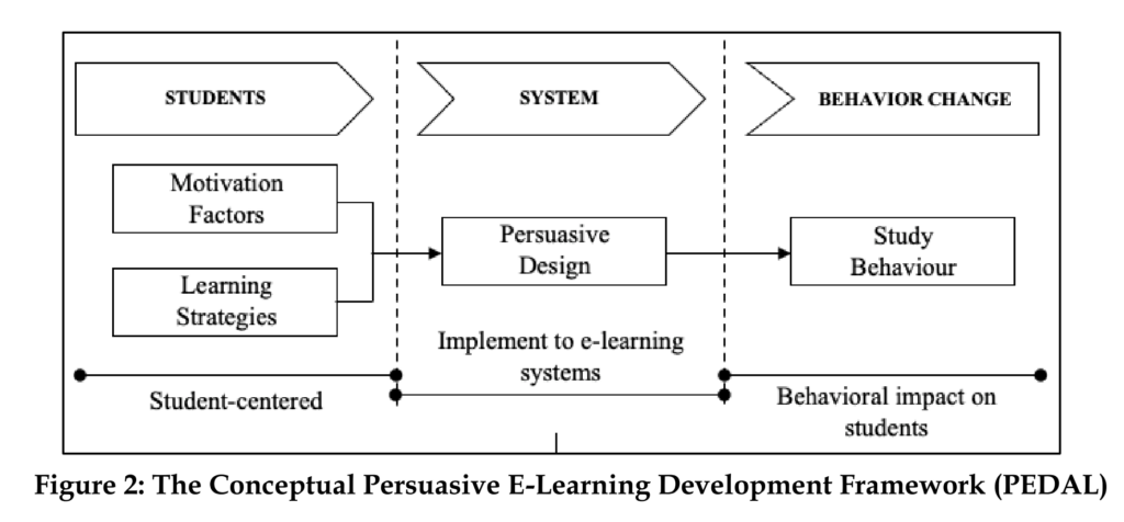 The PEDAL framework was developed to bridge this gap by integrating motivational factors, learning strategies, and persuasive design principles. Its aim is to foster behavior change and improve student engagement in e-learning environments. By focusing on these key components, PEDAL seeks to provide a more personalized and supportive learning experience for students, ultimately increasing retention rates and success in MOOCs.